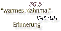 Auf dem Mahnmal der menschlichen Wärme, der ganz elementaren des Leibes - 36,5 Grad -, hat der Künstler die Namen aller 51 Nationen und nationalen Gruppen aufgeschrieben, die in Buchenwald zu Opfern wurden. Ins untere Segment meißelte er die Initialien K.L.B., die wie schon erwähnt, auch dem ersten Mahnmal des Obelisken eingeritzt waren. So vergegenwärtigt das jüngere Mahnmal das abwesende ältere Erinnerungszeichen der Häftlinge. Aus Holzteilen der niedergerissenen Baracken hatten die Hände der Befreiten das hölzerne Gedenkmal errichtet. Der Obelisk ist nicht mehr, und die Mehrzahl der im April 1945 befreiten Menschen lebt nicht mehr, aber die Wärme ihrer Hände ist da: so abwesend wie anwesend; dort im gleichbleibenden Wärmestrome der Betonplatte. Wenn wir uns bücken und sie berühren, spüren wir sie – wie wir uns selbst spüren. Erinnernd rühren wir an die Erinnerung derer, die damals überlebten. Wir treffen uns in einem Augenblick der Zeit, wir, die wir uns erinnern, heute, und die, die sich erinnerten, damals. Und an der Nahtstelle des sachten Treffens wird der Augenblick in die Ewigkeit gerettet, wie dort im Kasten der Uhr: 15.15 – so damals, so heute. Amen.