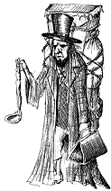 mit eisgrauem Haar und Bart und hartem Gesichtsausdruck. Halb seemännisch gekleidet, die Tracht recht abgenutzt.